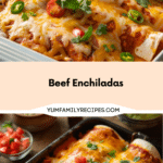 These beef enchiladas are packed with seasoned ground beef, green chiles, and melty cheddar cheese, all baked in a rich enchilada sauce. A comforting and flavorful dish perfect for family dinners.