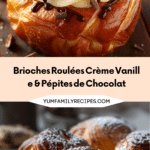 Délicieuses brioches roulées garnies d’une crème pâtissière à la vanille et de pépites de chocolat, parfaites pour le petit-déjeuner ou le goûter.