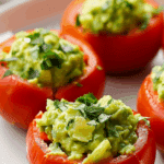 These are best enjoyed fresh. Because guacamole oxidizes (turns brown) and the tomato halves tend to get watery over time, it’s recommended to serve soon after stuffing. If you must prepare ahead, keep the guacamole separate, cover tightly with plastic wrap (pressing the wrap onto the surface of the guac to minimize air), refrigerate, and fill the tomatoes just before serving.