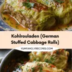 Kohlrouladen, or German Stuffed Cabbage Rolls, are a traditional comfort food made with tender cabbage leaves wrapped around a flavorful meat filling, then simmered in a rich gravy.