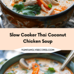 A creamy and aromatic Thai-inspired soup featuring tender shredded chicken, vibrant vegetables, and rich coconut milk infused with red curry paste. This slow cooker meal is comforting, flavorful, and perfect for an easy weeknight dinner.